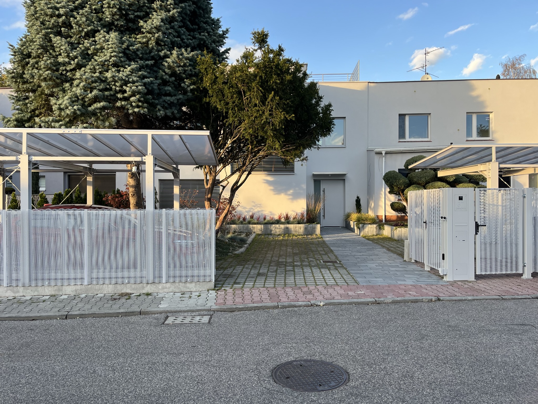 Jako wypełnienie elementów ogrodzenia zastosowanliśmy aluminiową siatkę cięto-cięgnioną o trochę udziwnionym kształcie niż standardowa siatka tego typu. Ten kształ dał nam lekkość i przezierności z jednej strony, ale z durgiej ciekawy wizualny efekt i osłonę częsci prywanej dla lokatorów posesji.