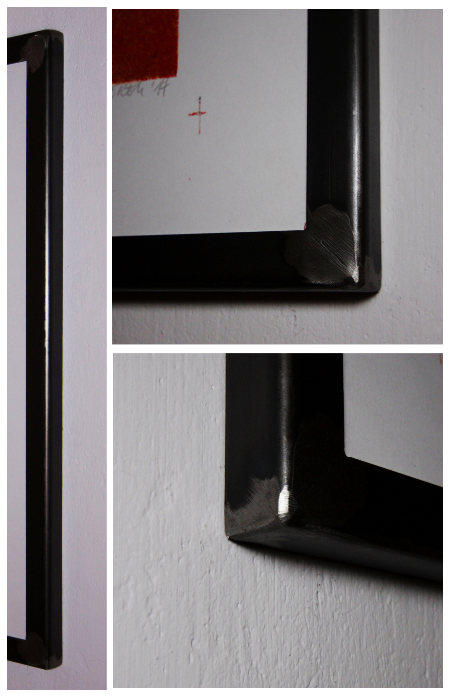 Prywatny projekt Roberta. Ramki na ilustracje wykonane z kątowników zimnogiętych, pokrytych bazbarnym matowym lakierem.