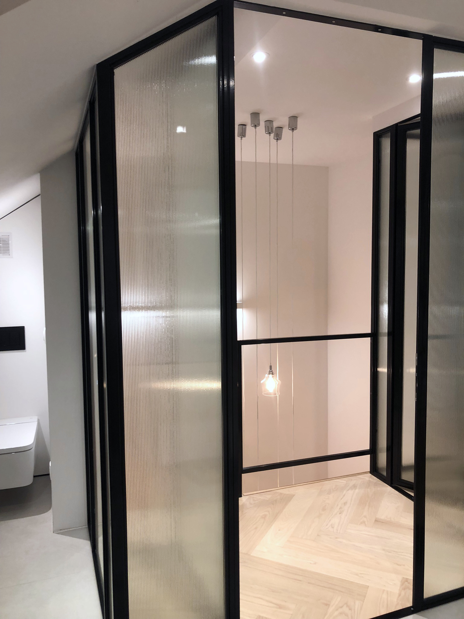 Ścianki działowe łazienki oraz sypialni z wypełnione szkła z efektem.